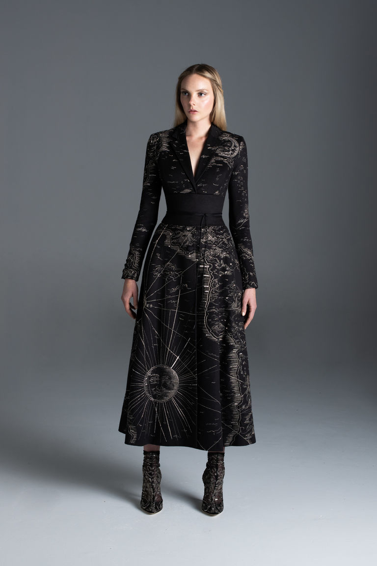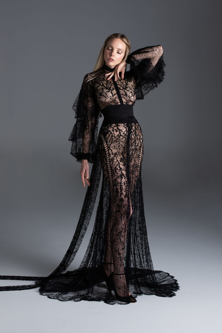 Featuring a dark and archaic aesthetic reminiscent of bygone eras; couture pieces in sombre tones of black, pewter, and moss are juxtaposed by rose and pearl accents, and embellished with hand-sewn Scandinavian folk inspired embroideries and intricate lithograph-style thread-work.