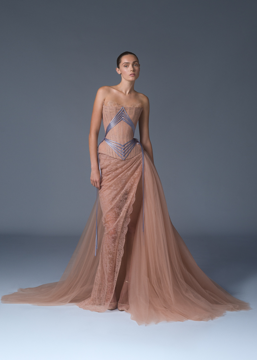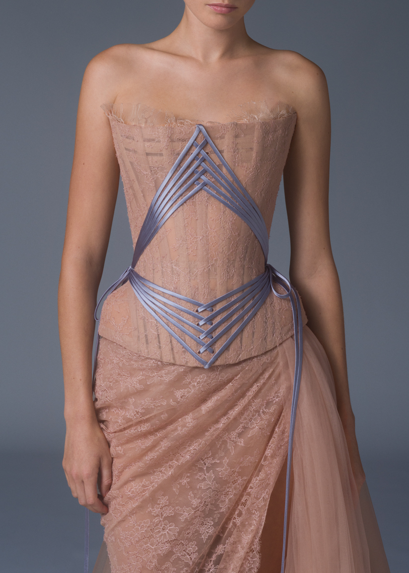 French Chantilly lace gown with wrapped ribbon corset and asymmetrical skirt.