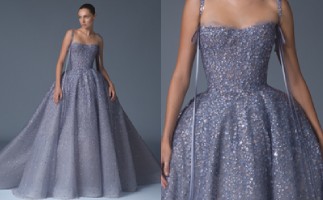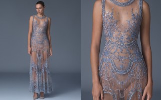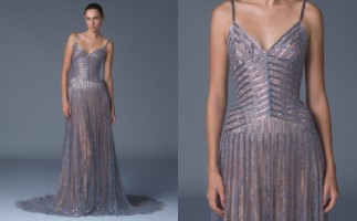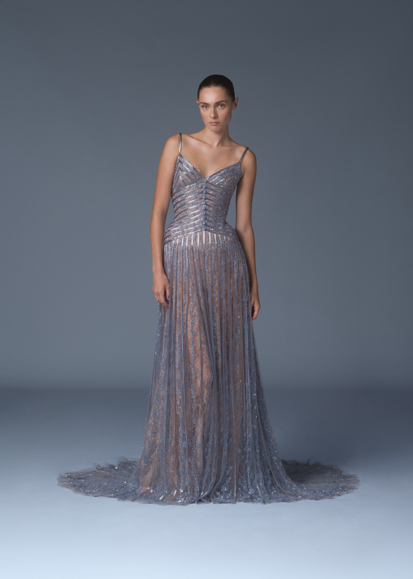 Beaded ribbon gown with Forget Me Not embroidery and French Chantilly lace underlay.