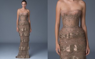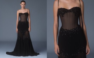 Silk georgette gown with crepe inlay and Forget Me Not embellishments and bow detailing.